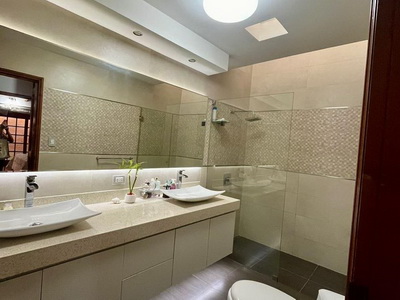 Casa de 2 plantas, AT. 300 M2, AC. 275 M2, sala con chimenea, comedor amplio, cocina con muebles altos y bajos, 3 dormitorios, el principal con walking closet y baño incorporado, aparte otro baño completo para los otros dos dormitorios. Tres ambientes adicionales: dos en la parte del sótano y uno adicional en el segundo piso que pueden usarse como sala de juegos, gimnasio, biblioteca u oficina. Ambiente de parrilla, Garaje para dos autos.